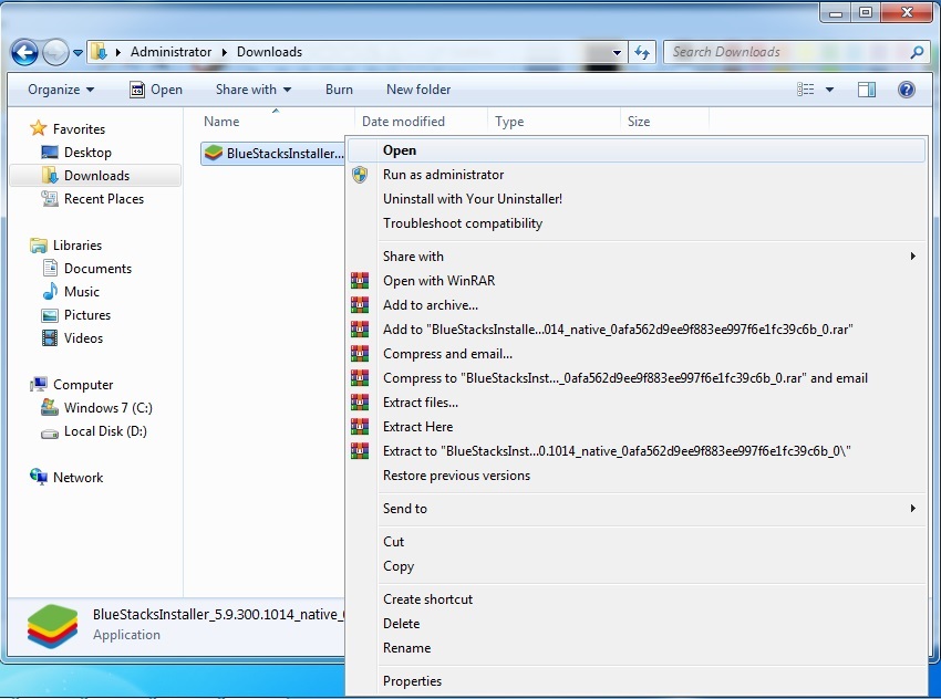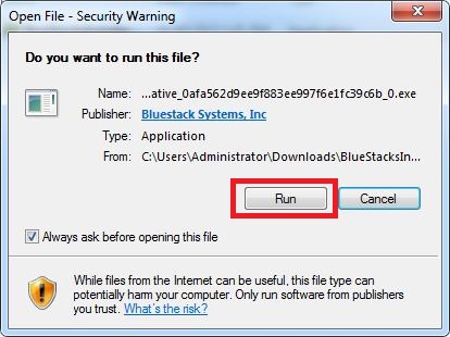 Khi đã tải về thành công, chọn mở file cài đặt BlueStacksInstaller.