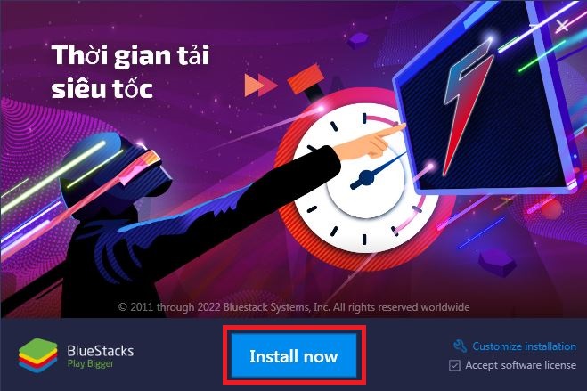 Ứng dụng BlueStacks khởi chạy giao diện. Bạn tiếp tục nhấn chọn “Install Now”. Chờ khoảng 5-7 phút để ứng dụng tiếp tục tải về file hệ thống và tự động cài đặt.
