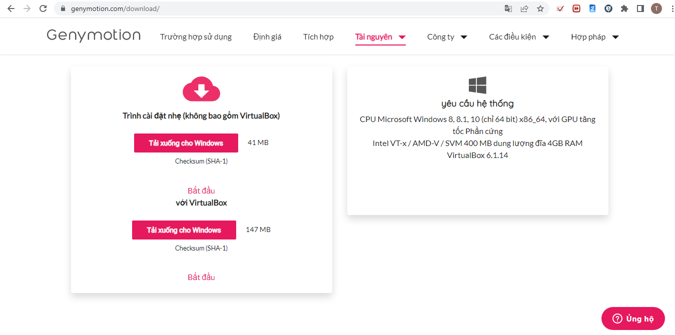 Đầu tiên, bạn cần truy cập trang chủ của ứng dụng giả lập Genymotion https://www.genymotion.com/download/ . Chọn tải về file cài đặt giả lập “Tải xuống cho Window”.