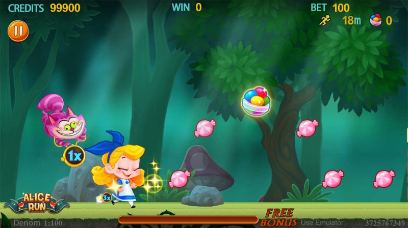 Alice Run là arcade game cực kỳ thú vị nếu bạn muốn thêm vào danh mục game Casino online của mình. Người chơi chỉ việc chạm vào màn hình để nhảy và ghi điểm. Mỗi viên kẹo ăn được trên đường đi được coi là một phần thưởng hoặc hệ số nhân thưởng. Ở dưới sẽ có một thanh Free Bonus, nếu lấp đầy sẽ kích hoạt phần thưởng cực hấp dẫn. Hãy giúp Alice và bạn bè của cô ấy chạy thoát khỏi đây và đừng mắc phải bất kỳ lỗi lầm nào.