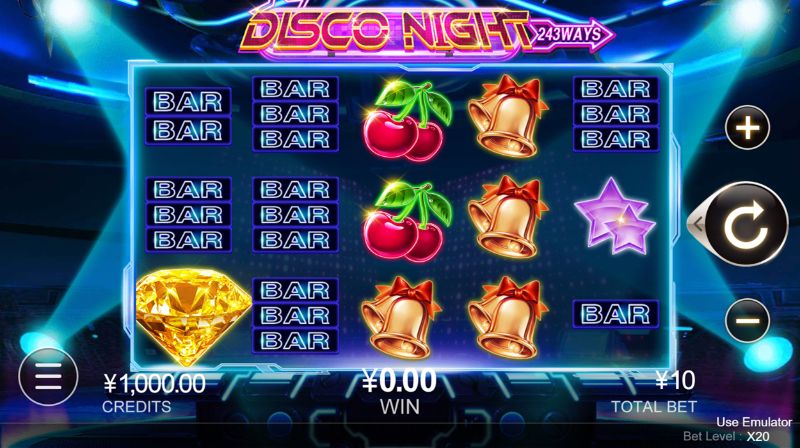 Disco Night mang phong cách nhẹ nhàng và sống động, xen lẫn với một chút yếu tố cổ điển mang lại niềm vui giúp cho người chơi xả stress. Biểu tượng “Kim cương Vàng” trong game có thể kích hoạt vòng quay miễn phí, càng nhiều biểu tượng xuất hiện thì số lượt quay miễn phí càng nhiều. Hệ số tiền thưởng sẽ tăng lên theo mỗi lần quay trong vòng quay miễn phí, tối đa có thể lên đến 150 lần.