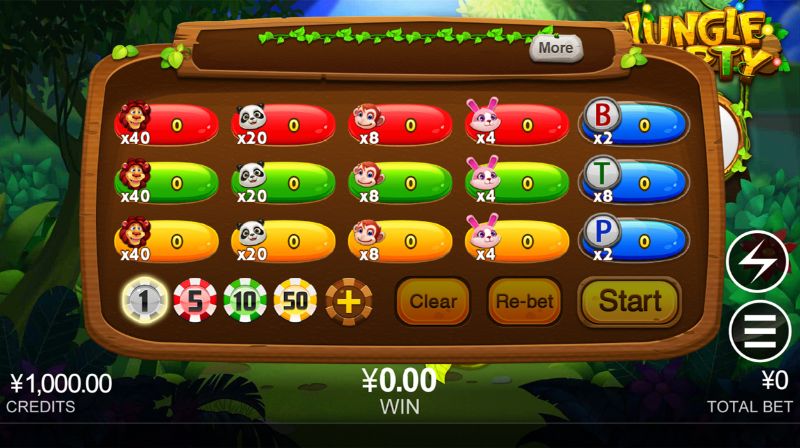 Jungle Party là một game rất thú vị lấy chủ đề là các loài động vật trong rừng. Tựa game kết hợp các yếu tố sáng tạo đặc biệt để tăng thêm phần thú vị cho trò chơi. Trò chơi cung cấp nhiều tùy chọn đặt cược, đôi khi các giải thưởng phụ cũng sẽ ngẫu nhiên xuất hiện đem lại số tiền không nhỏ. Nhìn chung thì đây là một Arcade game theo lối đỏ đen khá thú vị mà bạn nên trải nghiệm thử.