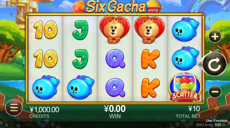 Six Gacha đưa người chơi trở về những ngày tháng tươi đẹp thời tuổi thơ với những chú gấu bông ngộ nghĩnh. Nếu bảng kết quả trả về có nhiều hơn 6 biểu tượng giống nhau xuất hiện thì sẽ giành được tiền thưởng. Trong lượt quay miễn phí, các biểu tượng cụ thể sẽ ngẫu nhiên biến thành các biểu tượng giống nhau, khiến cho việc thắng cược trở nên dễ dàng hơn bao giờ hết.
