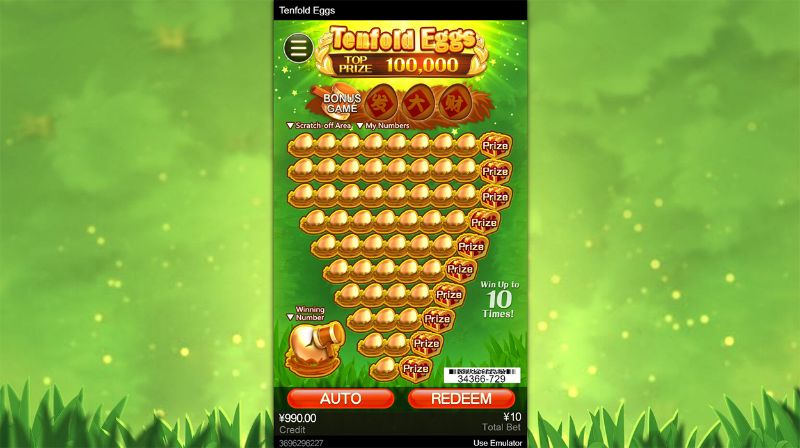 Tenfold Eggs là một arcade game theo kiểu bài cào. Nếu số 10 xuất hiện ở phần My Number, người chơi có thể nhận được hệ số nhân thưởng gấp 10 lần mức cược. Khi kích hoạt Bonus game, số 10 sẽ xuất hiện thường xuyên hơn, giúp người chơi thắng lớn tiền thưởng dễ dàng hơn.