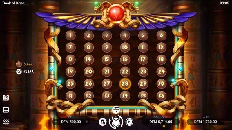 Trong game Book of Keno, người chơi sẽ tham gia một nhiệm vụ bí ẩn, hoàn thành nó để có được sự giàu sang phú quý. Có 36 ô số xuất hiện trên màn hình, nhiệm vụ của người chơi là lựa chọn 1 ô số may mắn và quay thưởng, nếu quay đúng vào ô số bạn chọn thì ăn tiền. Số tiền thưởng sẽ được tính theo công thức: [Tiền thưởng] = [Mức cược] x [3.46]
