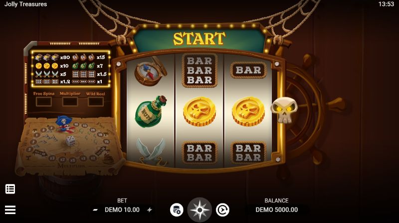 Jolly Treasures có bảng kết quả hinh dạng 3×3 với 5 dòng trả thưởng tất cả. Phần thưởng cao nhất trong game lên đến tối đa 3.000 lần mức cược. Với thiết kế giống như các máy slot game cổ điển, Jolly Treasures đảm bảo sẽ khiến người chơi dành hàng giờ đồng hồ để thử vận may. Hãy chơi ngay bây giờ để tham gia cuộc tìm kiếm kho báu bị chôn vùi với phần thưởng cực khủng.