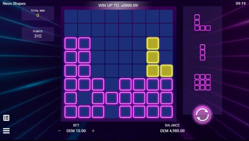 Neon Shapes là một game Xếp hình mang lại cơ hội ăn thưởng cho người chơi lên đến 10.000 lần mức cược. Với cách chơi thì có lẽ ai cũng biết rồi, lắp ráp các mảnh ghép cho sẵn làm sao để chúng tiêu diệt lẫn nhau. Màn chơi sẽ kết thúc nếu như bạn không lắp ghép thêm được gì từ mảnh ghép đang có. Càng ăn được nhiều dòng cùng một lúc thì tiền thưởng càng cao.