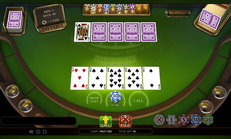 Oasis Poker Classic là một game Poker 5 lá bài truyền thống. Các quy tắc của trò chơi Poker cổ điển vẫn giữ nguyên: bạn sẽ chơi với nhà cái. Để bắt đầu trò chơi, người chơi đặt cược (các mốc chip từ 50 đến 1000) và nhấp vào nút ‘Deal’ để chia bài. Sau khi bài của bạn và nhà cái được chia sẽ đến phần tổng hợp kết quả, bài của ai có giá trị cao hơn sẽ thắng. Người chơi có thể đổi lá bài trong trường hợp bài xấu nhưng với điều kiện là mất khoản phí nho nhỏ.
