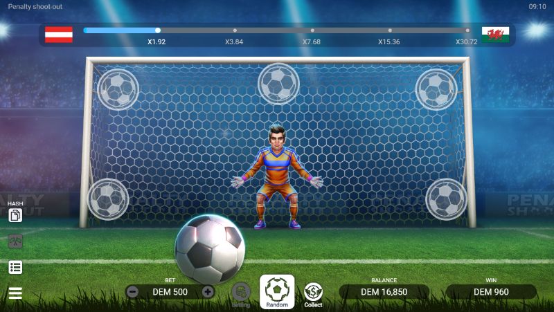 Nếu yêu thích bóng đá đặc biệt là những loạt sút Penalty cân não thì hãy đến với trò chơi Penalty Shoot-out cực thú vị của Evoplay. Bạn sẽ trực tiếp sút quả bóng vào khung thành, có 5 vị trí để lựa chọn sút. Nếu như thủ môn mà cản được bóng thì coi như mất tiền, nếu bạn đá được vào lưới thì ăn tiền. Sút liên tiếp vào lưới thì hệ số thưởng sẽ tăng lên theo cấp số nhân, tối đa lên đến 30 lần.