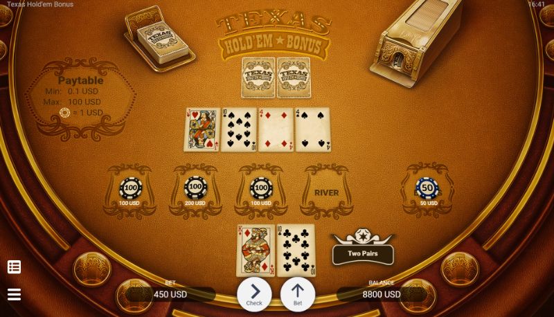 Texas Hold’em hiện là trò chơi Poker phổ biến nhất trên toàn thế giới. Khi trò chơi phát triển, lối chơi trở nên biến tấu phong phú và đa dạng. Đến với Texas Hold’em Bonus của Evoplay, các mốc của trò chơi bao gồm: Pre-flop, Flop (ba lá đầu tiên), Turn (lá thứ tư) và River (lá thứ năm). Màu sắc nhẹ nhàng của trò chơi mang lại cảm giác ấm áp và thư giãn, bối cảnh được lấy không khí đúng chất miền Viễn Tây luôn. Giao diện của game được thiết kế để đơn giản hóa đỡ rườm rà thao tác, mang tới sự tiện lợi nhất cho người chơi. Bạn cũng có thể tìm lại lịch sử đặt cược của mình nếu cần.