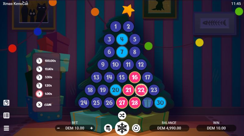 Để mở các hộp quà bên dưới cây thông Noel trong game Xmas KenoCat, người chơi cần đoán chính xác tối đa năm số trúng thưởng từ một đến 30, nằm trên màn hình của trò chơi. Người chơi đoán được càng nhiều số thì tiền thắng cuộc nhận được khi kết thúc trò chơi càng lớn. Sau khi mở tất cả 5 hộp quà để thì con mèo đen sẽ leo lên đỉnh cây thông Noel và bật đèn, mang đến cho người chơi giải thưởng ngẫu nhiên nhưng không hề ít chút nào.