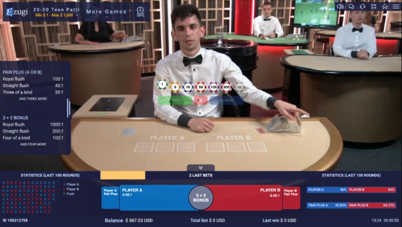 Teen Patti được livestream này trực tiếp từ studio xịn nhất của nhà phát hành Ezugi ở Romania, đảm bảo sẽ mang lại thêm sự phấn khích và niềm vui cho người chơi. Tựa game Casino online này còn có rất nhiều mức đặt cược phụ khác để bạn tha hồ lựa chọn khiến cho mỗi ván bài trở nên thú vị hơn.