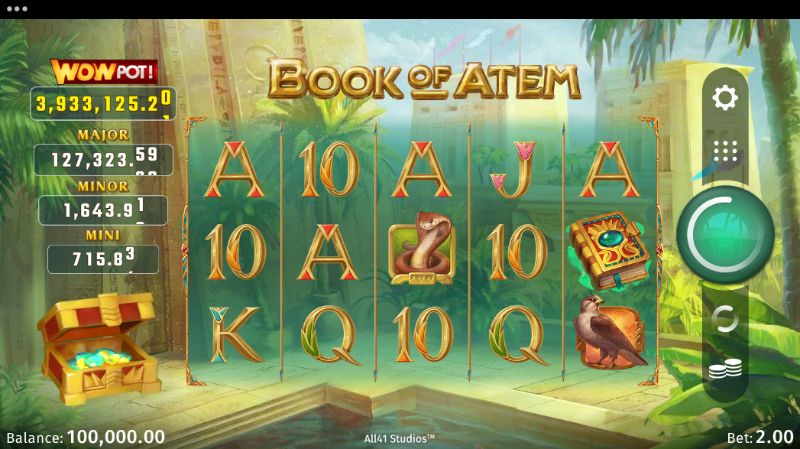 Bảng kết quả trong game Book of Atem có hình dạng 3×5 (3 dòng 5 cột) với tổng cộng 10 dòng trả thưởng. Trong Vòng quay miễn phí, người chơi có cơ hội nhận được phần thưởng lên đến 5.000 lần mức cược. 3 biểu tượng Scatter xuất hiện sẽ cho bạn 10 lượt quay miễn phí cực đã. Để ăn được phần thưởng nổ hũ trong game là không dễ thế nhưng chỉ cần ăn một cái hũ to nhất WOW POT! là đủ tiêu cả tháng luôn.