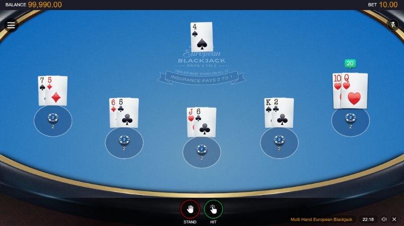Trong game European Blackjack, sẽ có tới 5 vị trí chơi để bạn đặt cược, mỗi vị trí tương ứng với 2 lá bài khác nhau. Người chơi có thể chọn một trong 4 lệnh như Surrender (bỏ bài), Stand (giữ bài), Hit và Double. Nếu cuối cùng bài của bạn to hơn nhà cái thì sẽ được ăn thưởng. Nếu ngay trong 2 lá bài đầu có một con Ace và một trong các con 10, J, Q, K chất bất kỳ thì người chơi được Blackjack và thắng.