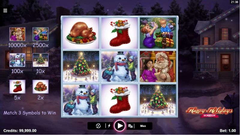 Trong game cào bài Happy Holiday Scratch, bảng kết quả sẽ có tổng cộng 9 ô. Nhiệm vụ của bạn là phải lật mở cả 9 ô này, nếu như có 3 biểu tượng giống nhau thì sẽ được ăn tiền thưởng tương ứng. Phần thưởng cao nhất trong game lên đến 10.000 lần mức cược, con số khổng lồ mà ai cũng muốn được thử vận may một lần.