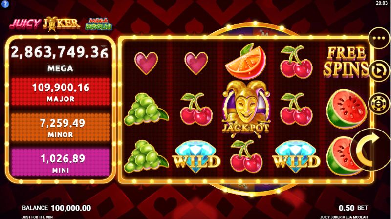 Trong game slot Juicy Joker, bảng kết quả sẽ có hình dạng 3×5 (3 dòng 5 cột) với tổng cộng 20 dòng trả thưởng. 3 biểu tượng Jackpot đặc biệt xuất hiện là bạn sẽ được tham gia Vòng quay may mắn với cơ hội ăn con giải thưởng cực khủng. Ngoài ra 3 biểu tượng Free Spins xuất hiện tại cột 1, 3 và 5 cũng sẽ cho người chơi 10 lượt quay miễn phí tha hồ kiếm vốn để chơi. Có 4 mốc nổ hũ trong game với hũ Mega là cao nhất, nhỏ nhất là hũ Mini.