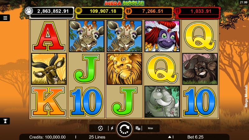 Mega Moolah là game slot của Microgaming lấy cảm hứng từ những loài động vật hoang dã. Bảng kết quả trong game có hình dạng 3×5 (3 dòng 5 cột) với 25 dòng trả thưởng tất cả. 3 biểu tượng Scatter trở lên sẽ mang đến cho người chơi 15 lượt quay miễn phí, nếu ăn được dòng thắng nào sẽ được x3 số tiền thắng.