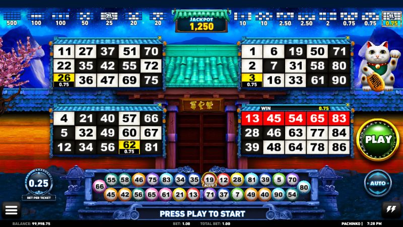 Trong game Pachinko, người chơi có cơ hội nhận được phần thưởng lên đến 5.000 lần mức cược. Đối với những ai đã quen với game Bingo rồi thì cách chơi của Pachinko cũng chẳng có gì khác cả, được cái là mức trả thưởng ngon ăn hơn các game khác nhiều. Sau khi nhấn nút ‘Play’, một dãy 30 quả bóng sẽ được chạy dưới màn hình. Nếu kết quả của 30 quả bóng tạo nên dòng thắng trên các bảng số, người chơi sẽ nhận được tiền thưởng tương ứng.