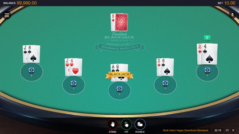 Trong game Vegas Downtown Blackjack, sẽ có tới 5 vị trí chơi để bạn đặt cược, mỗi vị trí tương ứng với 2 lá bài khác nhau. Người chơi có thể chọn một trong 4 lệnh như Surrender (bỏ bài), Stand (giữ bài), Hit và Double. Nếu cuối cùng bài của bạn to hơn nhà cái thì sẽ được ăn thưởng. Nếu ngay trong 2 lá bài đầu có một con Ace và một trong các con 10, J, Q, K chất bất kỳ thì người chơi được Blackjack và thắng.