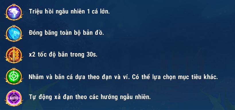 - Súng Đào Yêu: khi bắn trúng cá nào sẽ khiến cá đó bị giảm 50% tốc độ di chuyển. Thời gian hết hạn súng là 120 giây.