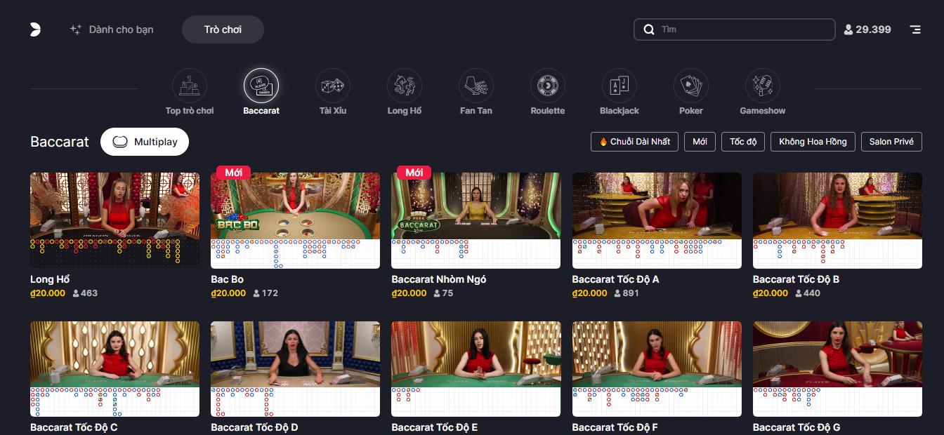 Những game Baccarat phổ biến và được nhiều người chơi tham gia nhất đó là: Long Hổ, Bac Bo, Baccarat Nhòm Ngó, Baccarat Tốc Độ từ A đến S, Baccarat Tốc Độ Không Hoa Hồng A, Baccarat Tốc Độ Không Hoa Hồng C, Baccarat Tốc Độ Không Hoa Hồng, Baccarat A, Baccarat B, Baccarat C, Baccarat Squeeze, Baccarat Kiểm Soát Bóp.